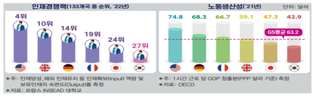 한국은 근로자숙련도 등 노동의 질적 측면을 나타내는 인적자본에서도 주요국(G5) 대비 비교열위였다. 2022년 ‘인재경쟁력 지수주5)에 따르면, 한국의 인재경쟁력은 세계 133개국 중 27위를 기록하여 ‣미국(4위), ‣영국(10위) 등주6) G5 국가에 비해 낮은 순위를 기록했다. OECD에 따르면, 근로시간 당 부가가치 창출을 나타내는 노동생산성 역시 한국은 2021년 기준 42.9 달러를 기록하여, G5 평균(63.2)에 비해 20.3 달러나 낮았다.