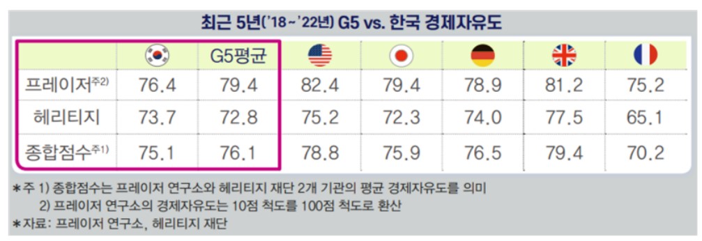 [경제자유도] G5 평균 76.1 vs. 한국 75.1, 韓 6개국 중 5위