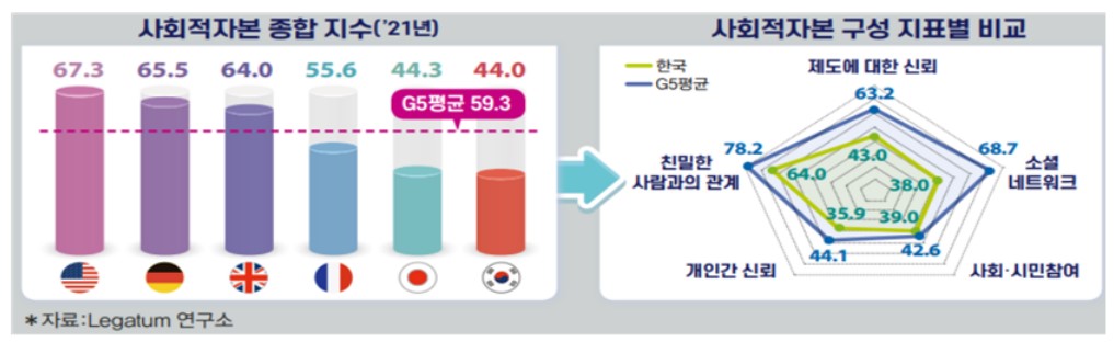 전경련은 사회적자본주9)이 확충될수록 정부 신뢰 증대로 정책 실효성이 제고되고, 공동체 내 정보교류가 촉진되어 생산성 증대에 기여한다고 주장했다. 2021년 기준, 영국 레가툼 연구소(Legatum Institute)에서 발표한 한국의 사회적자본 종합 지수는 44.0으로 G5 평균(59.3) 수준을 하회했다. 사회적자본 지수를 구성하는 세부 지표(5개)주10)에서도 한국은 모든 분야에서 G5 평균에 미흡했다.