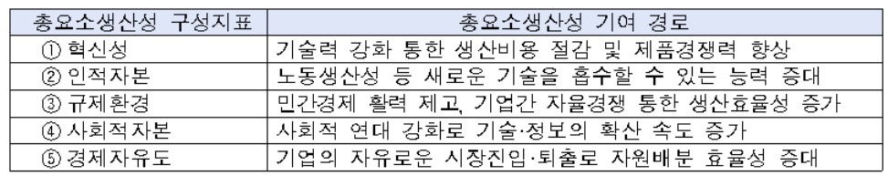*총요소생산성 구성 요소:①혁신성,②인적자본,③규제환경,④사회적자본,⑤경제자유도