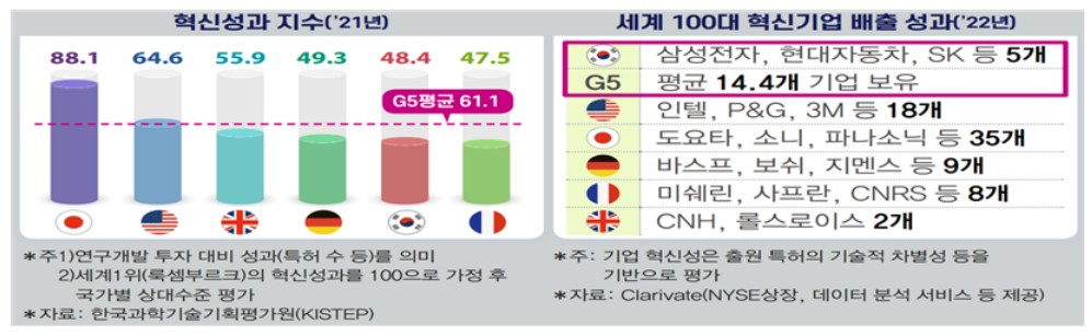 한국과학기술기획평가원(KISTEP)에 따르면, 한국은 2021년 기준 연구개발 활동의 실질적인 성과(R&D 투입 대비 특허 수 등)를 측정하는 ‘혁신성과 지수’가 48.4에 불과하여 G5 평균(61.1)을 하회했다. 2022년 기준, ‘글로벌 100대 혁신기업주4)’에 포함된 국내 기업 수 역시 5개에 불과해 G5 평균(14.4개사)의 1/3수준에 불과했다.