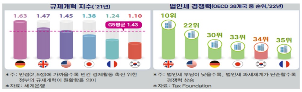주요국 대비 과도한 규제환경도 한국의 총요소생산성을 저해하는 요인으로 작용하고 있다. 세계은행이 발표하는 한국의 규제개혁 지수주7)는 2021년 기준, 1.10에 그쳐, G5 평균(1.43) 수준에 비해 낮았다. 또한, 미국 조세재단에서 평가하는 법인세 경쟁력주8) 역시, 한국은 2022년 기준 OECD 38개 회원국 중 34위에 불과한 것으로 나타났다. 이에 대해 전경련은 한국이 주요국에 비해 민간 경제활동 촉진을 위한 규제혁신 노력이 부족하고, 기업의 조세부담이 높아 전반적인 기업 경영환경이 열위에 놓인 상황이라고 설명했다.