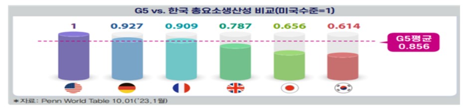 [총요소생산성, 미국=1] 한국 0.614(미국의 61.4%) vs. G5 평균 0.856