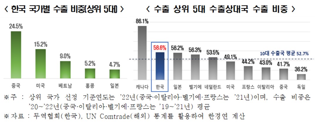 이는 우리나라 수출의 약 40%가 중국(수출 비중 24.5%, ’20~’22년 평균)과 미국(15.2%)에 쏠려 있는 상황이 반영된 결과다. 한국의 전체 수출 대비 수출 상위 5개국에 대한 수출 비중은 58.6%로, 캐나다(86.1%)에 이어 두 번째로 높았다.