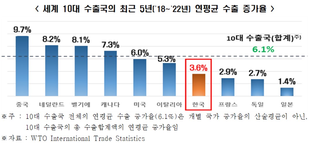 * 한국의 최근 5년(’18~’22년) 연평균 수출 증가율(3.6%)은 10대 수출국(6.1%)보다 크게 미흡