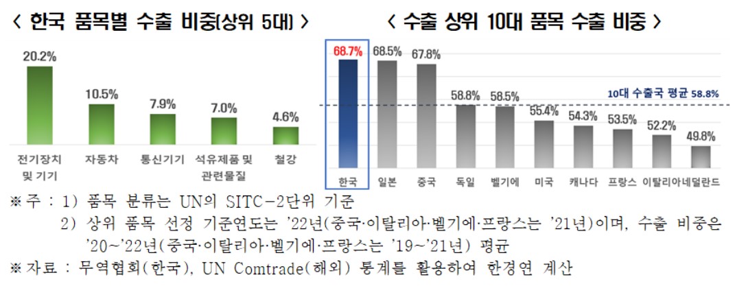 한경연은 전기장치·기기(수출 비중 20.2%, ’20~’22년 평균), 자동차(10.5%) 등 특정 품목 의존도가 높은 한국의 수출구조가 반영된 결과라고 보았다. 실제로 상위 10대 수출 품목의 수출액이 전체 수출에서 차지하는 비중은 한국(68.7%)이 세계 10대 수출국(평균 58.8%) 중 가장 높게 나타났다.