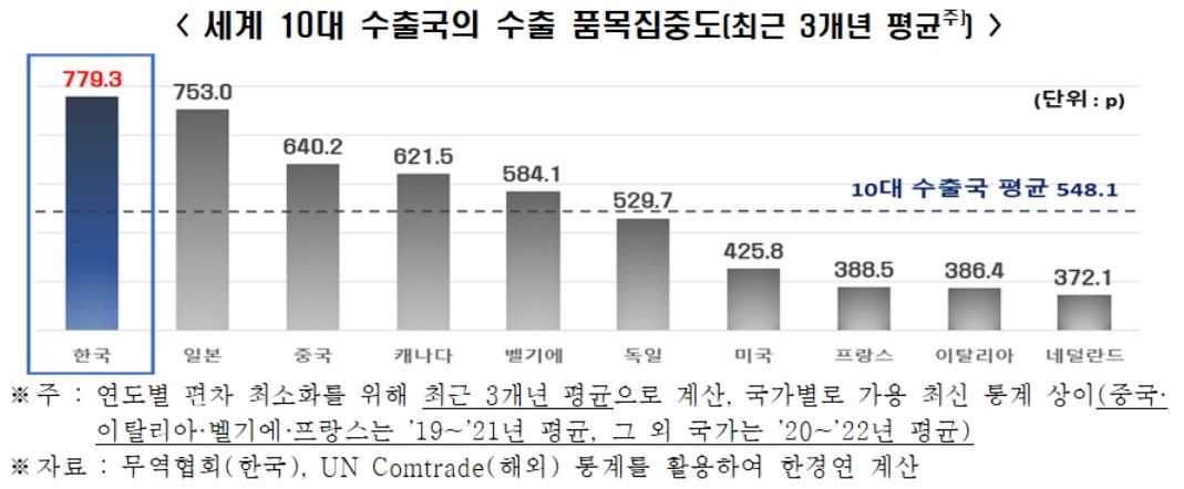 한경연이 한국무역협회 통계와 UN의 국제무역 통계를 활용하여 주요 국가들의 수출 품목 집중도(UN의 SITC주2) 2단위 분류 기준)를 계산한 결과, 한국은 779.3p으로 세계 10대 수출국(평균 548.1p) 중 가장 높은 것으로 조사되었다.