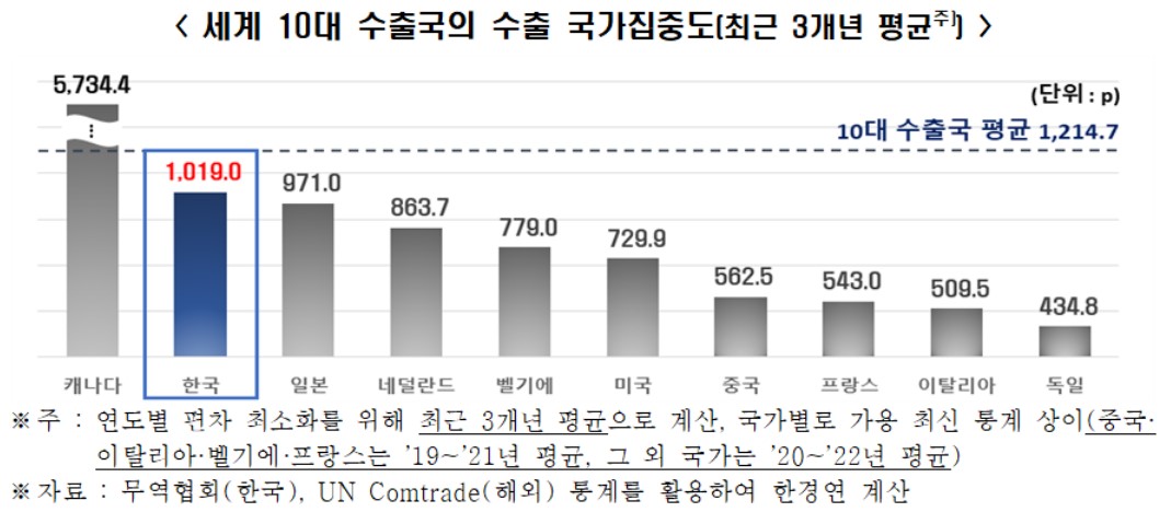 우리나라의 수출 대상 국가 집중도는 1,019.0p으로, 세계 10대 수출국(평균 1,214.7p) 중 캐나다(5,734.4p)주3)에 이어 두 번째로 높은 것으로 나타났다.