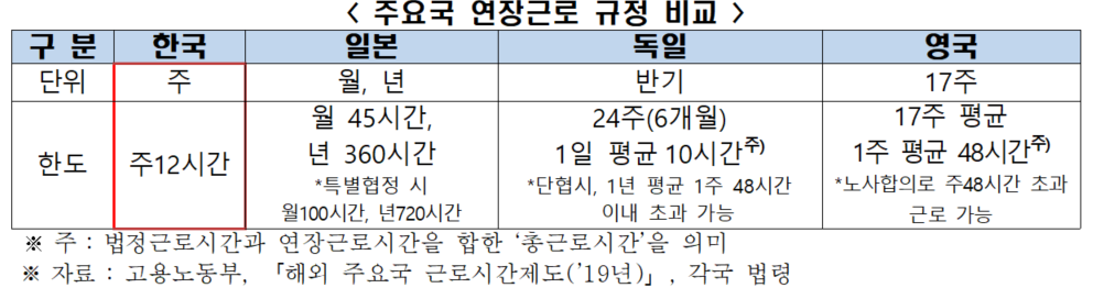 근로시간 선택권 측면에서는 한국은 근로시간 제한을 주(週) 단위로 규율하며 1주 연장근로를 최대 12시간으로 제한하는 반면, 독일, 일본, 영국은 월(月) 단위 이상으로 근로시간을 탄력적으로 운영하고 있다.