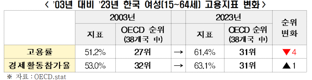 한국 여성고용률(’23년) 61.4%, OECD 38개국 중 31위… 20년간 하위권 지속