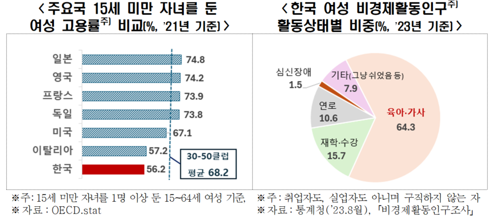 15세 미만 자녀 둔 여성 고용률, 한국 56.2% vs. 30-50클럽 평균 68.2%