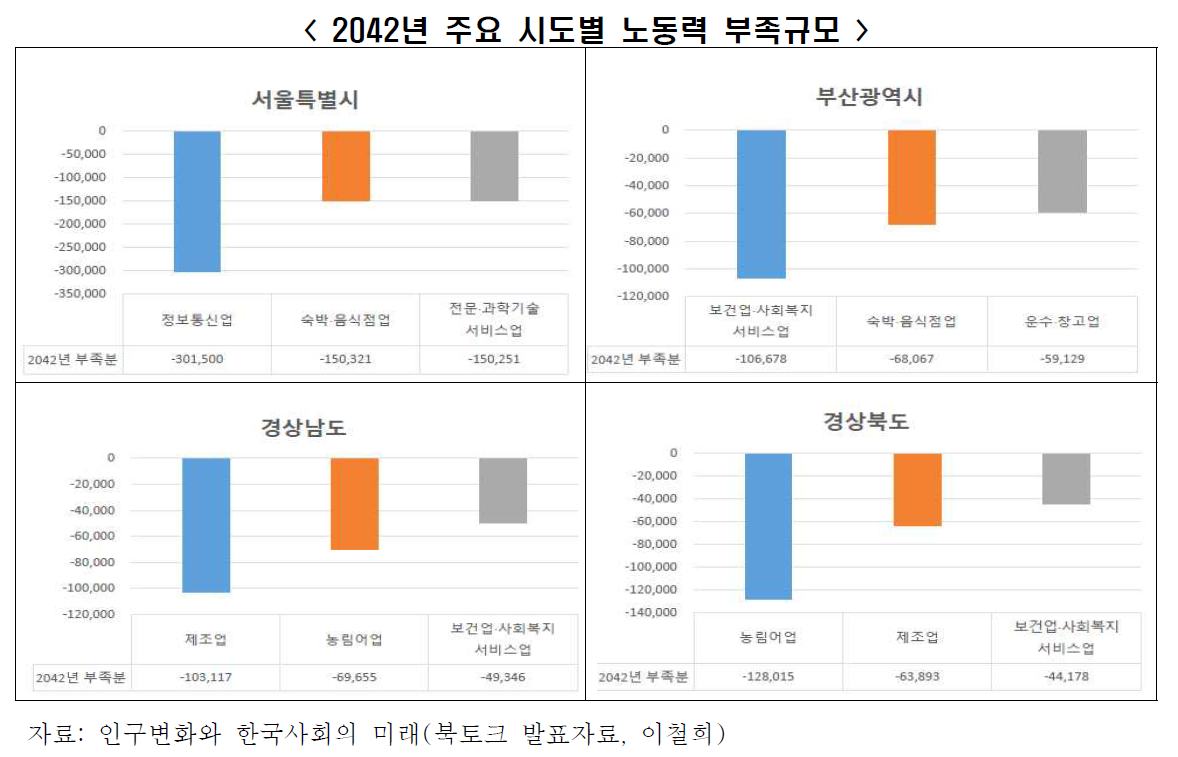 구체적으로 서울의 정보통신업은 약 30만 명(-301,500명), 부산의 보건업·사회복지서비스업은 약 10만 명(-106,678명), 경남 제조업은 약 10만 명(-103,117명), 경북 농림어업은 약 13만 명(-128,015명)의 인력이 부족할 것으로 내다봤다.