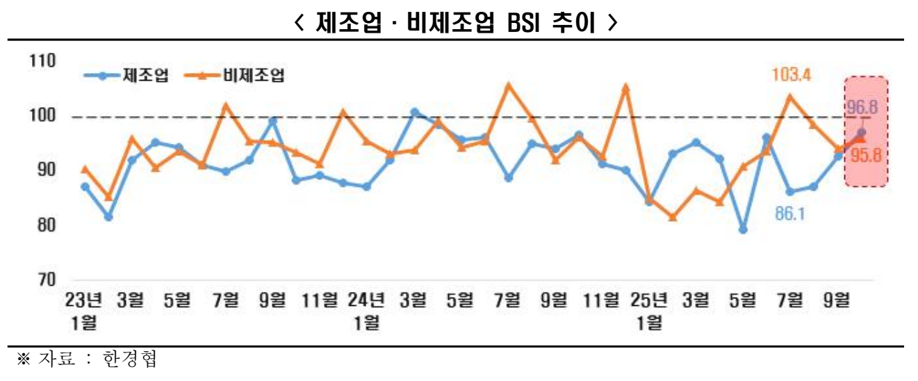 * 주4) 비제조업 BSI 전망치 : 103.4(’25.7월) 98.3(8월) 93.8(9월) 95.8(10월)