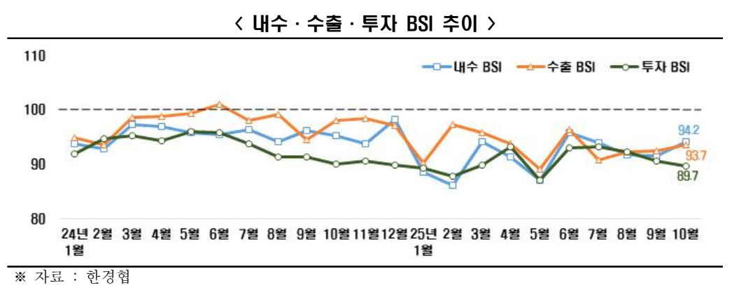10월 종합 BSI(96.3) 기준선 하회, 특히 투자 BSI(89.7) 80대로 하락