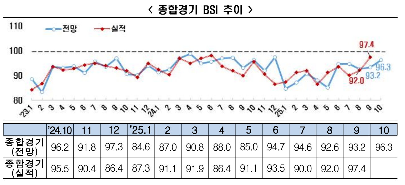 * 주2) BSI 전망치 : 99.1(’22.4월) 97.2(5월) 96.3(6월) ... 94.6(’25년 7월) 92.6(8월) 93.2(9월) 96.3(10월)