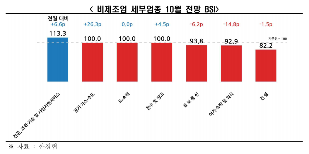 비제조업 세부 업종(총 7개) 중에는 ▸전문, 과학·기술 및 사업지원서비스(113.3)가 유일하게 호조 전망을 보였다. 기준선 100에 걸친 ▸전기·가스·수도(100.0) ▸도소매(100.0) ▸운수 및 창고(100.0)을 제외한 나머지 3개 업종은 부진주9)이 전망된다. 한경협은 내수 부진이 장기화됨에 따라 기업들의 내수 회복에 대한 기대감이 낮은 상황이라고 풀이했다.