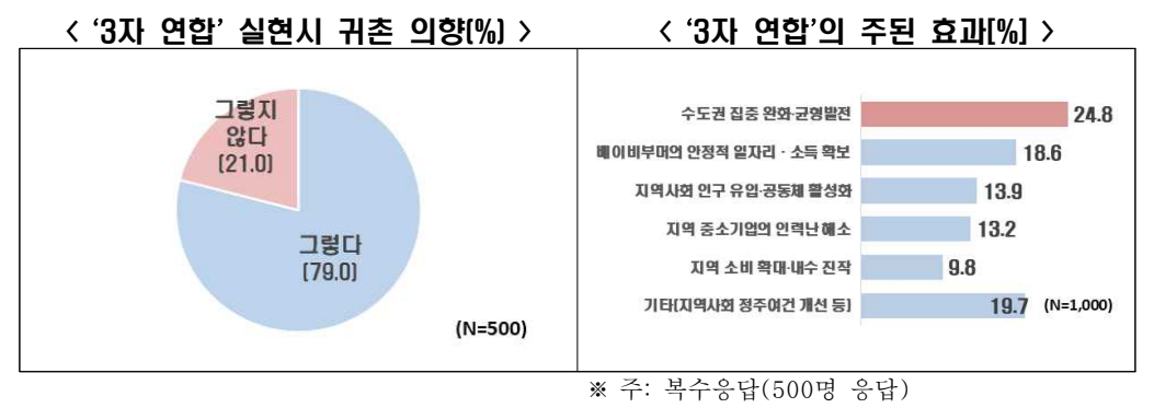 수도권 베이비부머의 10명 중 8명(79.0%주5))은 ‘3자 연합’ 모델이 실현될 경우 귀촌할 의향이 있다고 응답했다. 이는 지역 중소기업 취업에 따른 귀촌 의향(73.0%) 보다 높은 비율로, ‘3자 연합’ 모델이 수도권 베이비부머의 귀촌을 촉진하는 효과적인 대안이 될 수 있음을 의미한다.
