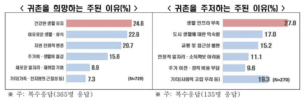 - 귀촌 희망 이유는 ‘건강한 생활(24.6%)’, 우려 요인은 ‘생활 인프라 부족(27.8%)’
