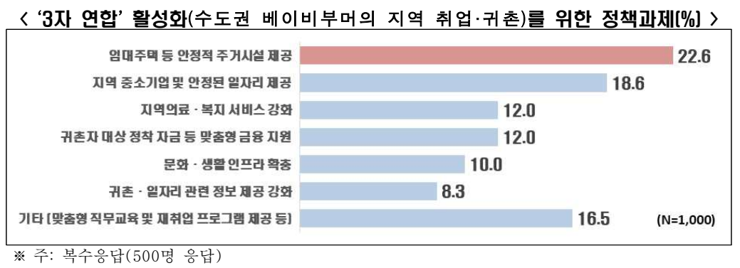 - 베이비부머 귀촌활성화 위해 ‘임대주택 등 안정적 주거시설 제공[22.6%]’ 필요