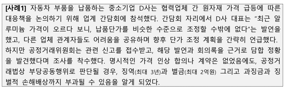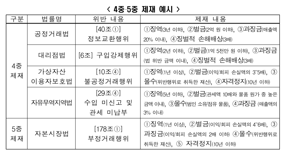 일례로 공정거래법에 따르면, 사업자 간 가격·생산량 등의 정보를 교환하는 행위만으로도 담합 합의로 추정될 수 있다주3). 이 경우 징역과 벌금이 병과될 수 있으며 과징금과 징벌적 손해배상까지 더해지면 최대 4중 제재가 가능하다.