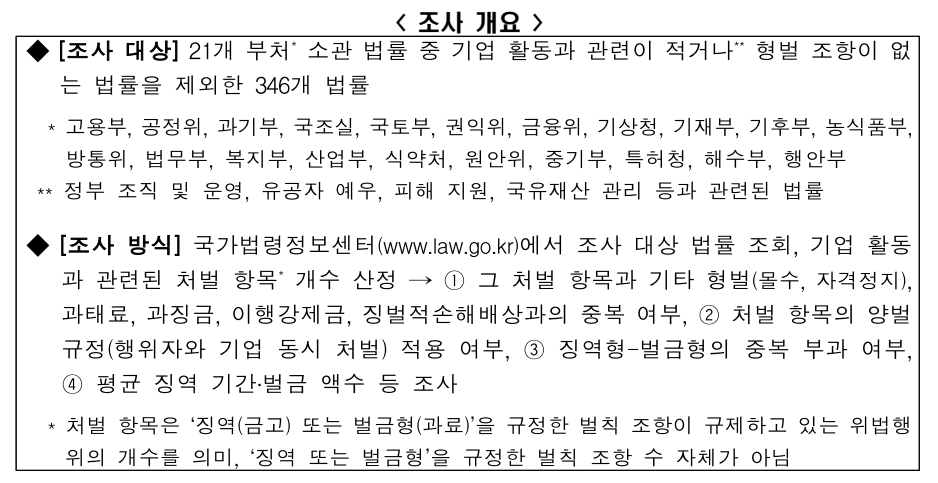 한국경제인협회(이하 한경협)는 10일, 경제법률 형벌 조항 전수 조사를 시행한 결과, 기업 활동과 관련성이 높은 21개 부처 소관 346개 경제법률에서 총 8,403개의 법 위반행위가 형사처벌(징역, 벌금 등) 대상이라고 밝혔다.주1)