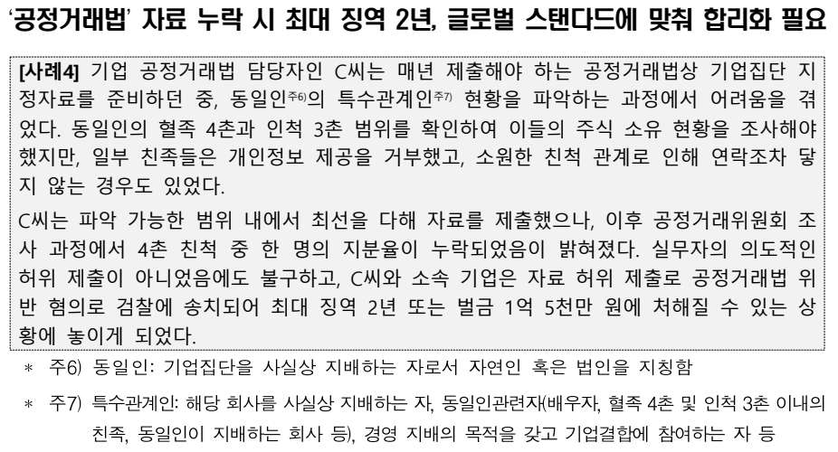 공정거래법에 따르면, 기업집단주8) 지정을 위해 기업은 매년 특수관계인 현황, 주식 소유 현황 등 지정자료를 제출해야 한다. 이를 미제출 또는 허위 제출할 시 최대 징역 2년 또는 벌금 1억 5천만 원의 벌금에 처한다.