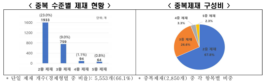 - 경제법률 위반행위의 약 34%는 겹겹이 중복제재, 5중 제재까지 존재