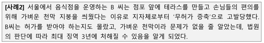 건축법에 따르면 사전 허가 없이 도시지역에서 건축(신축·증축·개축 등)하거나 건폐율주4) 및 용적률주5) 기준을 위반한 경우, 형사처벌(3년 이하의 징역 또는 5억 원 이하의 벌금) 대상이 될 수 있다. 점포 앞 테라스, 외부 계단 가림막용 새시(경량 철골) 및 아크릴판 설치 등 영업 편의 목적의 경미한 구조물 변경도 법적으로는 ‘증축’으로 간주하여 처벌 대상에 해당한다.