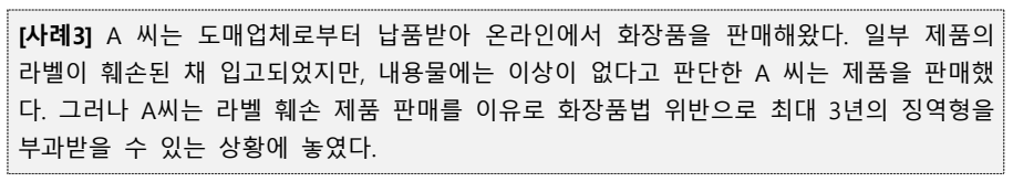 화장품법에 따르면, 화장품 판매자가 직접 라벨을 제거하지 않더라도 기재· 표시 사항이 훼손된 제품을 판매하거나, 판매 목적으로 보관·진열만 해도 3년 이하의 징역 또는 3천만 원 이하의 벌금에 처해질 수 있다.