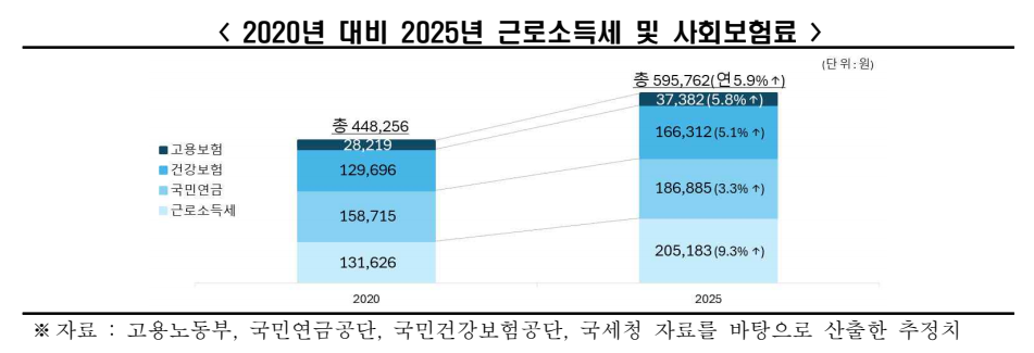 그 결과, 임금 중 세금과 사회보험료가 차지하는 비중은 12.7%에서 14.3%로 확대되었고, 근로자의 월평균 실수령액은 2020년 307.9만 원에서 2025년 355.8만 원으로 연평균 2.9% 오르는 데 그쳤다.