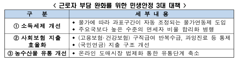 - ①소득세제 개선, ②사회보험 지출 관리, ③농수산물 유통 개선 통해 부담 줄여야