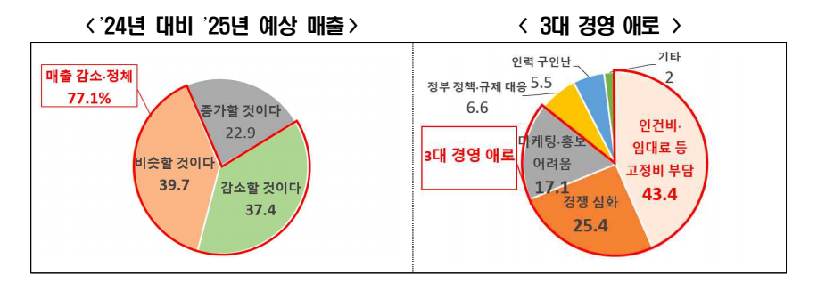 조사에 따르면 소상공인 10명 중 8명(77.1%)이 2024년 대비 2025년 예상 매출이 “비슷하거나 감소할 것”이라고 답했다. 경영성과에 대해서도 ‘악화됐다’('매우 악화됐다' 19.2%, '다소 악화됐다' 27.3%)는 응답이 46.5%였으며, 그 배경은 원자재·임대료 부담 증가, 세금 부담 등이 꼽혔다.