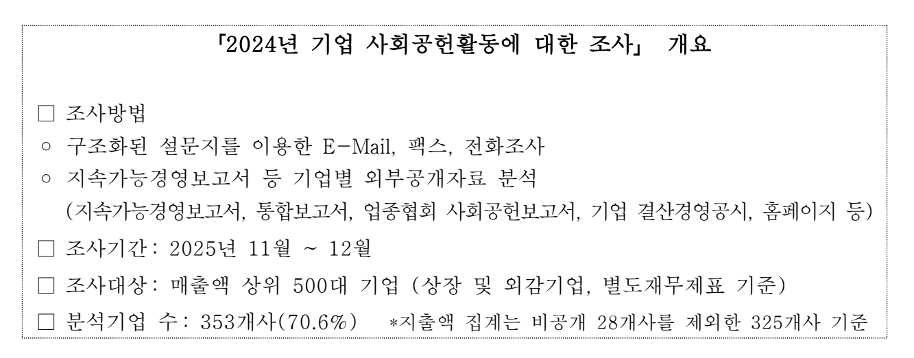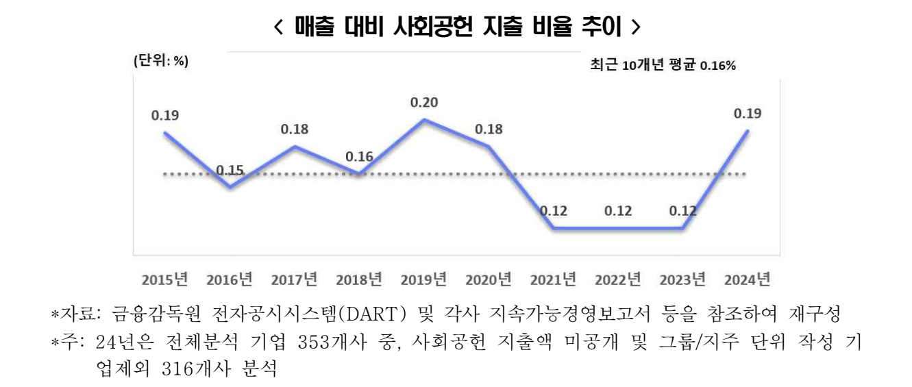 2024년 기업 1개사당 평균 사회공헌 지출액은 약 166억 원으로 2002년 조사 시작 이후 역대 최대치를 기록했다. 이에 대해 한경협 관계자는 “2024년에 매출 500대 기업의 매출액과 영업이익이 전년 대비 증가하면서 기업들이 이윤의 사회환원을 늘린 결과로 보인다주1)”고 설명했다.