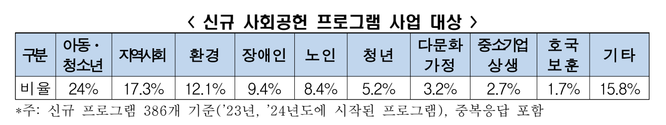 신규 사회공헌: 아동·청소년(24%)이 가장 많아…지역사회(17.3%), 환경(12.1%) 순