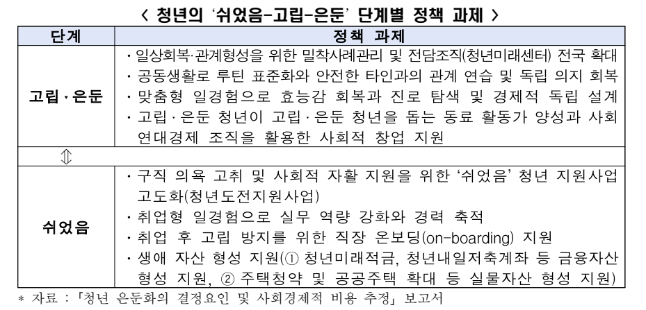 - [정책 과제] ‘쉬었음 → 고립 → 은둔’ 경로를 조기에 끊는 정책*이 중요