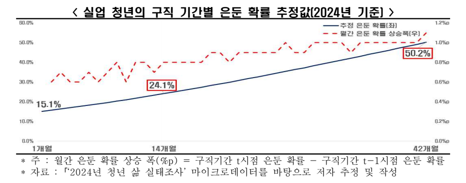특히, 실업 청년의 은둔 확률은 구직기간이 길어질수록 더 빠르게 상승하는 경향을 보였다. 보고서는 “구직 1개월 차 실업 청년의 은둔 확률은 약 15.1%이며, 구직기간이 길어져 14개월주7)에 이르면 약 24.1%로 상승하고, 3.5년(42개월)이 지나면 은둔 가능성이 50%를 상회한다”고 밝혔다.