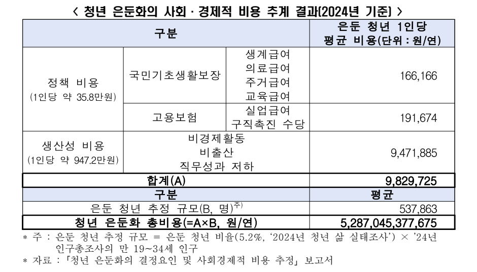 보고서는 청년층 은둔 비율 수치를 바탕으로, 정책 및 생산성 측면에서 청년의 은둔으로 인해, 이들 청년이 비은둔 상태일 때에 비하여 우리 사회·경제가 상대적으로 더 많이 부담하게 되는 비용을 추산했다. 그 결과, 2024년 기준 은둔 청년은 1인당 연간 약 983만원의 비용을 더 유발하고 있으며, 이를 전체 은둔 청년 규모에 적용하면 비용은 연간 약 5.3조원에 달했다.