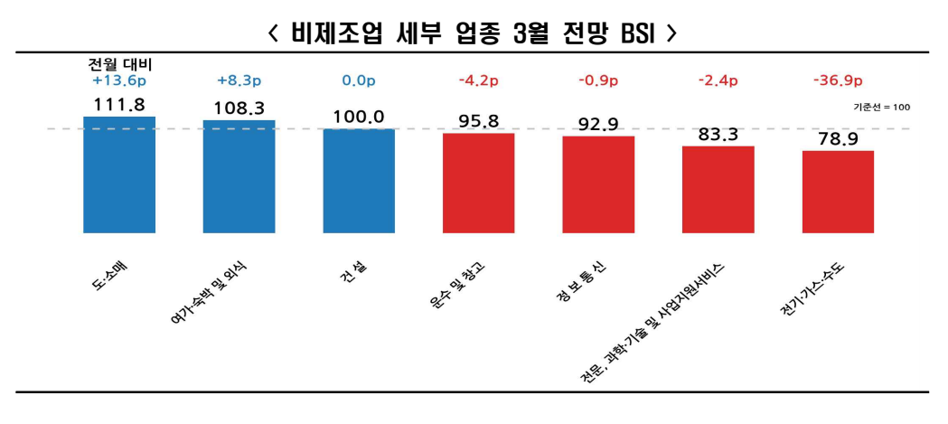 비제조업 세부 업종(총 7개) 중에는 완만한 내수 회복세주7)에 힘입어 ▸도· 소매(111.8)와 ▸여가‧숙박 및 외식(108.3)이 호조 전망을 보였다. 기준선(100)에 걸친 건설을 제외한 ▸전기‧가스‧수도(78.9) 등 나머지 4개 업종주8)은 업황 부진이 전망된다.