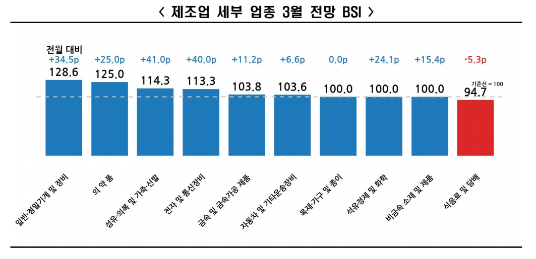 지수값이 가장 높은 업종은 전력 인프라·설비 등이 포함된 ▸일반‧정밀기계 및 장비(128.6) 업종이었으며, 전월 대비 지수 상승 폭이 가장 큰 업종은 신학기 의류·신발 등 소비 수요 기대감이 반영된 ▸섬유‧의복 및 가죽‧신발(114.3, 전월 대비 +41.0p) 업종으로 나타났다.