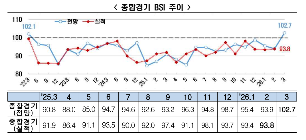 * 주2) BSI 전망치 : 102.1(’22.3월) → 99.1(4월) → 97.2(5월) … 95.4(’26.1월) → 93.9(2월) → 102.7(3월)