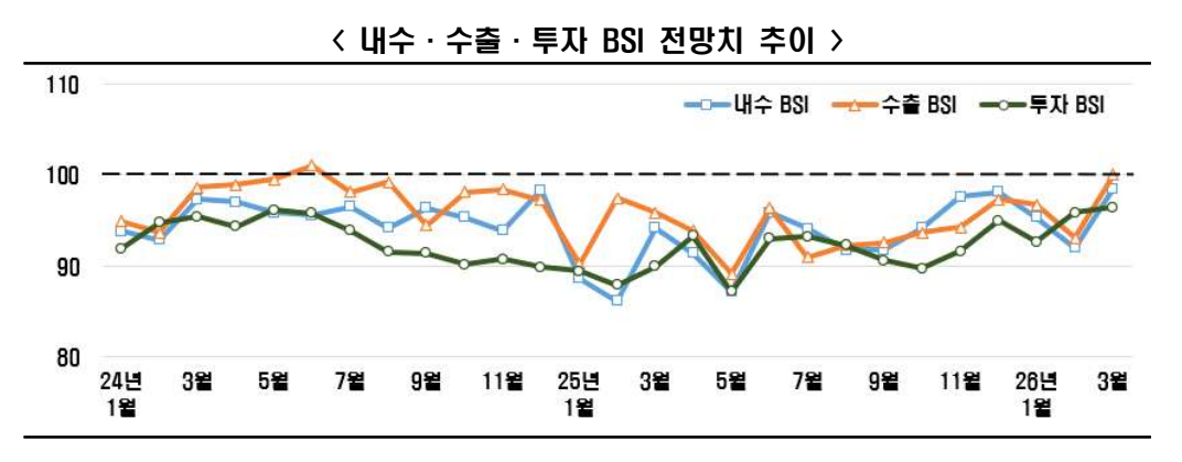 * 주12) 부문별 BSI 전망치 변화(2월 → 3월) : [증가] ▸수출(93.1 → 100.0, +6.9), ▸내수(92.0 → 98.5, +6.5), ▸채산성(91.7 → 97.9, +6.2), ▸투자(95.8 → 96.4, +0.6) ▸고용(94.5 → 94.7, +0.2), [동일] ▸재고(103.0 → 103.0, +0), [감소] ▸자금사정(93.9 → 93.5, △0.4)