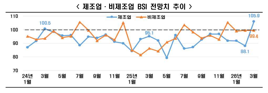 * 주4) 비제조업 BSI 전망치 : 105.2(’25.12월) → 98.9(’26.1월) → 99.5(2월) → 99.4(3월)
