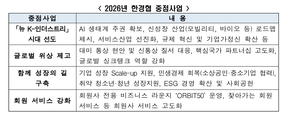 한경협은 총회를 통해 2026년 4대 중점사업으로 △뉴 K-인더스트리 시대 개막, △글로벌 위상 제고, △함께하는 성장의 길 구축, △회원 서비스 강화 등을 제시했다.