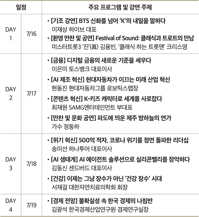 올해로 38회를 맞이한 제주하계포럼은 ‘위기를 기회로 바꾸는 기업가정신, 도전과 혁신’을 주제로 7월 16일부터 19일까지 3박 4일간 제주도에서 진행됐다. 올해는 디지털 금융, 로보틱스, 여행, 헬스케어 등 각 산업을 대표하는 기업인들이 연사로 자리해 급변하는 환경 속에서의 미래 전략과 혁신 사례를 공유하며 기업가정신과 미래 전략을 함께 모색했다. 특히 이번 포럼에는 침체된 내수 시장에 활력을 불어넣는 K-바캉스 실천의 취지를 포함해 의미를 더했다.