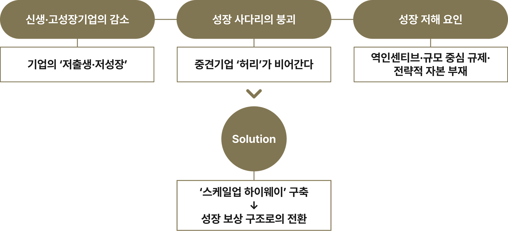 성장의 중심축이 되어야 할 중견기업의 자연 증가율이 최근 4년간 0%대에 머무른 점 역시 심각하다. 중소 → 중견 → 대기업으로 이어지는 성장 사다리가 작동하지 않으면서, 중견에서 중소로 되돌아간 기업 수가 오히려 더 많아진 역전 현상까지 나타나고 있다. 기업의 성장은 생존 전략임에도 불구하고, 성장 과정이 부담으로 전환되는 ‘성장 역설’이 심화되고 있는 것이다. 이 같은 경직성은 세 가지 구조적 병목에서 비롯된다.