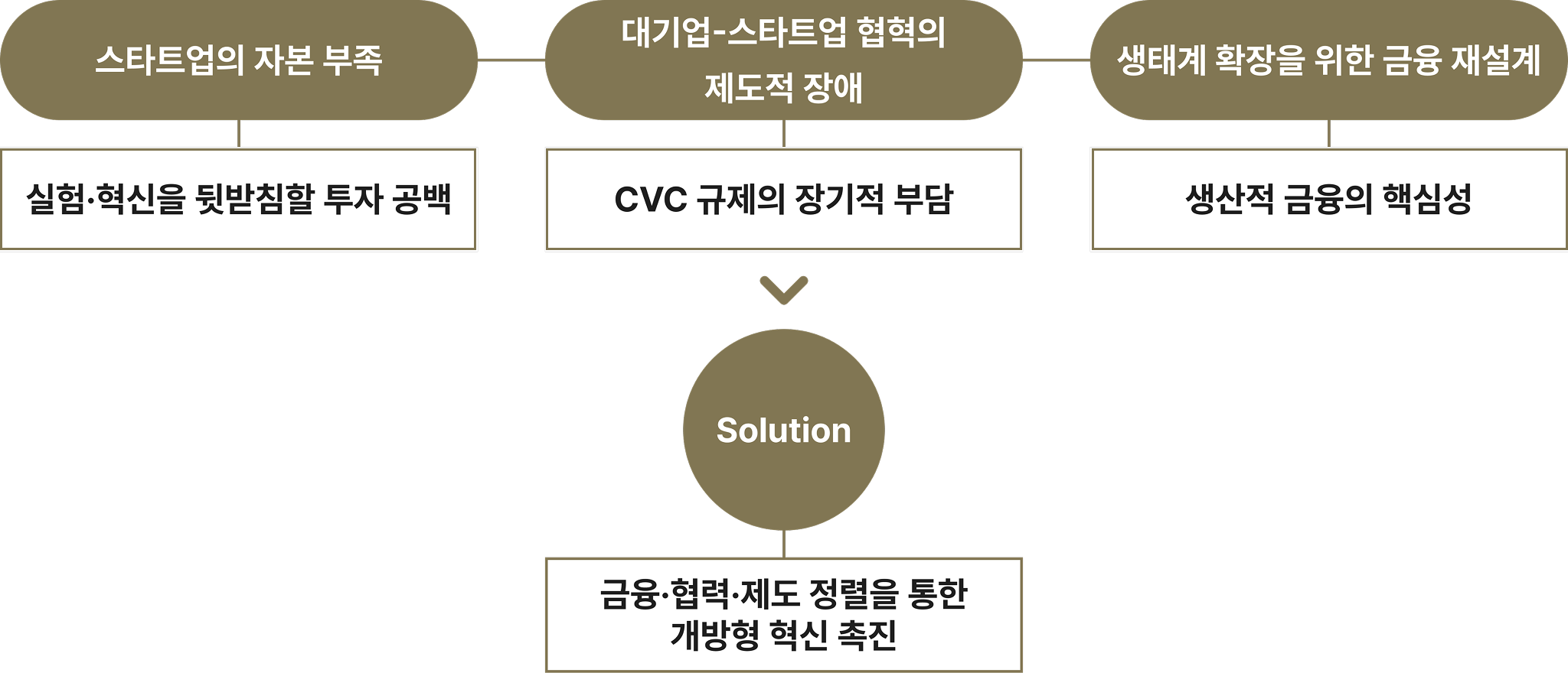 다만, 혁신의 속도를 지탱할 생산적 금융 기반은 여전히 부족하다. 한국의 M&A 비중은 5% 수준에 그치며, 미국 90% 이상과 대비하면 회수·성장 경로가 협소하다. CVC 및 지주회사 규제도 여전히 대기업 자본의 전략적 투자 흐름을 제약해 첨단 제조·AI·바이오 등 대규모 투자가 요구되는 분야에서 생태계 확장을 가로막는다. 이 문제는 기업 간 협력의 촉진을 통해 풀어야 한다.