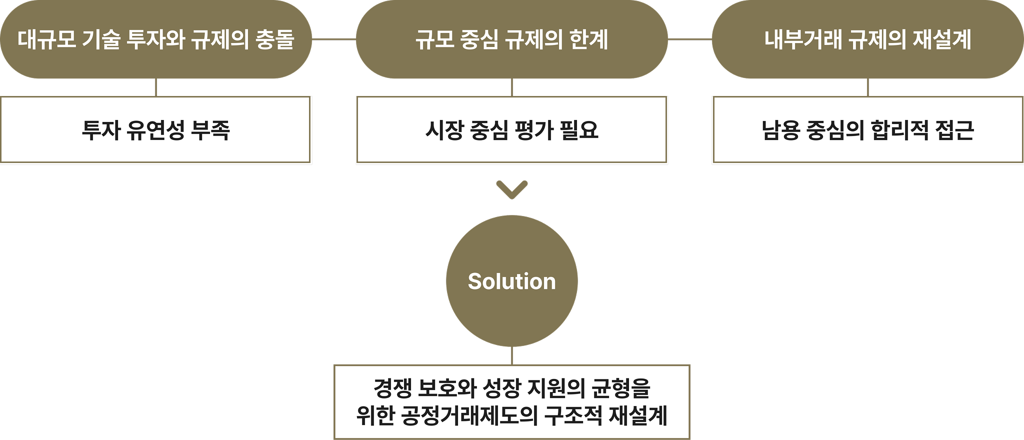 공정거래법 개편은 규제 완화가 아니라 시대 정합성을 되찾는 작업이다. 대기업집단 억제 조항을 전면 재검토하고 경제력 집중 방지와 혁신 촉진이 균형을 이룬 구조로 재설계해야 한다. 이를 통해 다양한 규모의 기업이 기술과 자본을 기반으로 성장 경로를 자연스럽게 확장할 수 있는 제도적 사다리가 복원될 수 있을 것이다.