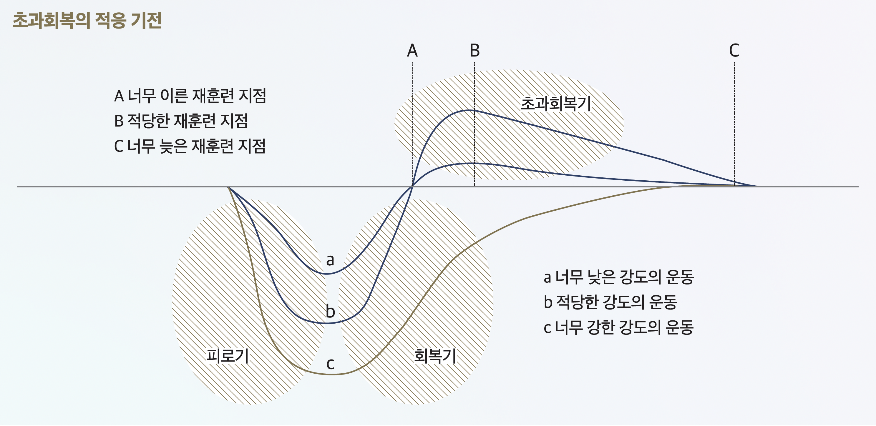 이 과정에서 근섬유는 수선될 뿐 아니라 단백질 합성이 촉진되면서 더 굵고 단단하게 재구성된다. 단순히 원래 상태로 되돌아가는 것을 넘어 다음 자극을 더 잘 견딜 수 있는 구조로 업그레이드되는 것, 이를 스포츠의학에서는 ‘초과 회복(Super Compensation)’이라고 부른다.