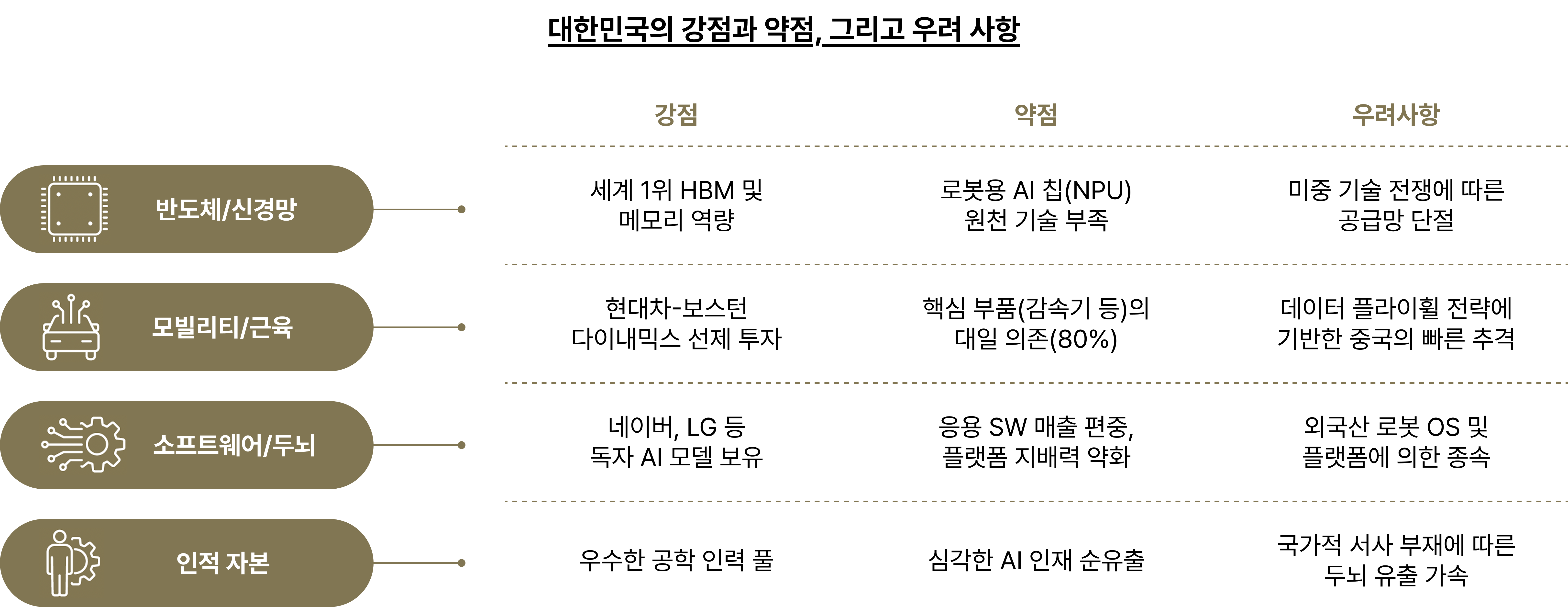 가장 뼈아픈 대목은 세계를 압도하는 ‘AI 두뇌’가 없다는 사실이다. 2024년 기준 국내 AI 산업의 매출은 대부분 챗봇이나 영상 분석 같은 응용 서비스에 쏠려 있다. 피지컬 AI의 심장이라 할 수 있는 연산 부품과 장치 분야의 비중은 5%에도 못 미친다. 이는 우리가 아무리 세계 최고의 로봇 ‘몸체’를 만든다 해도, 정작 그 몸에 명령을 내리는 ‘영혼’은 미국의 엔비디아나 구글, 혹은 중국 플랫폼에 의존해야 함을 의미한다.