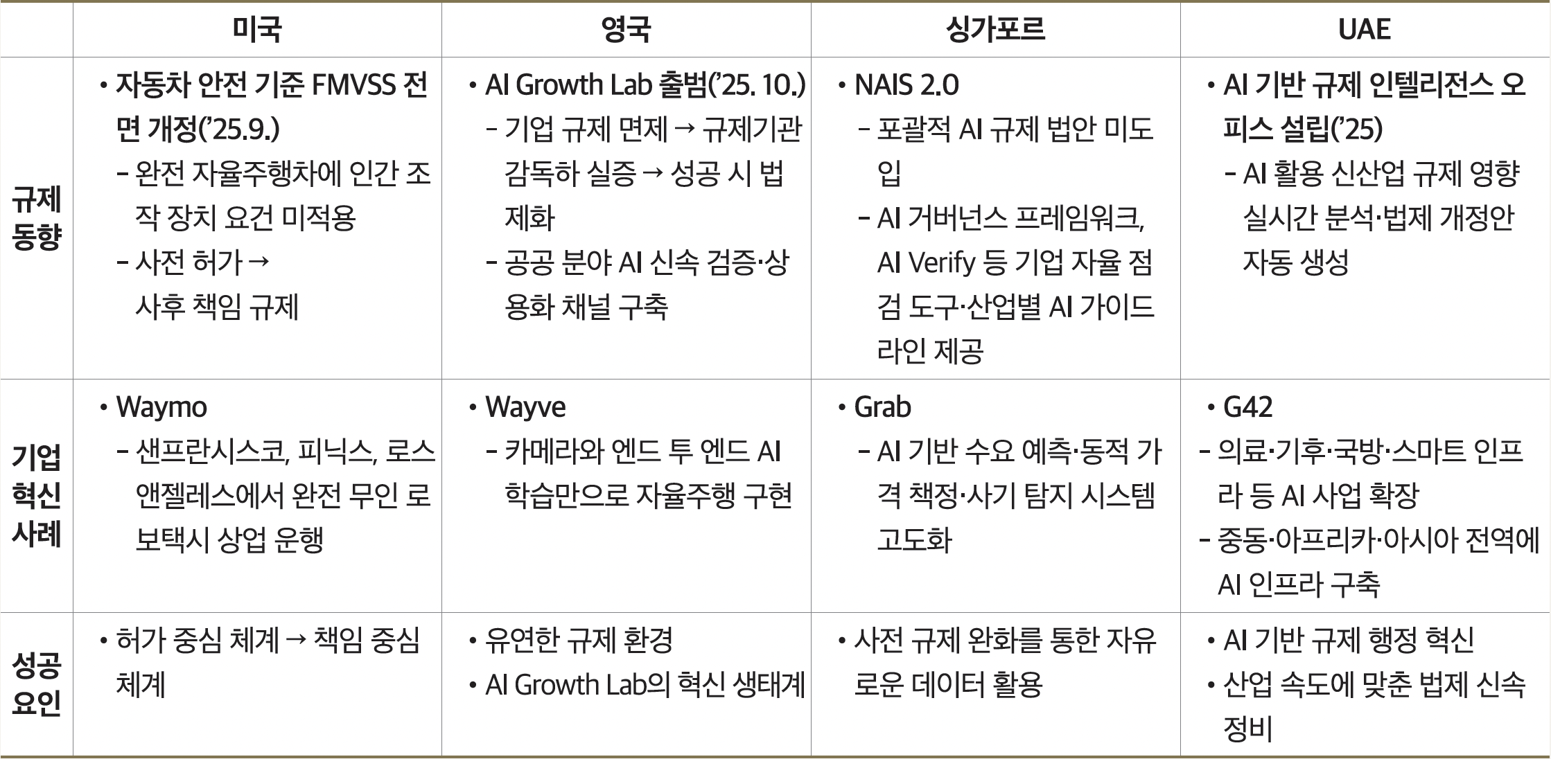 네 나라의 사례에서 공통적으로 발견되는 성공 요인이 있다. 첫째, 규제의 목적을 금지에서 책임으로 전환했다. 새로운 기술을 막는 대신, 실험을 허용하고 결과에 대한 책임을 명확히 했다. 둘째, 사전 허가 대신 사후 관리 원칙을 적용했다. 기업이 먼저 시장에서 실험하고, 축적된 데이터를 바탕으로 규제 기준을 업데이트하는 순환 구조를 만들었다. 셋째, 규제 샌드박스를 실험으로 끝내지 않고, 법령 개정의 입구로 설계했다. 파일럿이 성공하면 즉시 영구 법령화하는 회로가 작동한다. 넷째, 규제 행정 자체에 AI를 도입해 법제의 민첩성을 높였다. 그리고 이 모든 국가에서 규제 혁신은 단순한 제도 변화가 아니라, 웨이모, 웨이브, 그랩, G42 같은 구체적인 기업의 성공과 성장으로 이어졌다는 점이 중요하다.